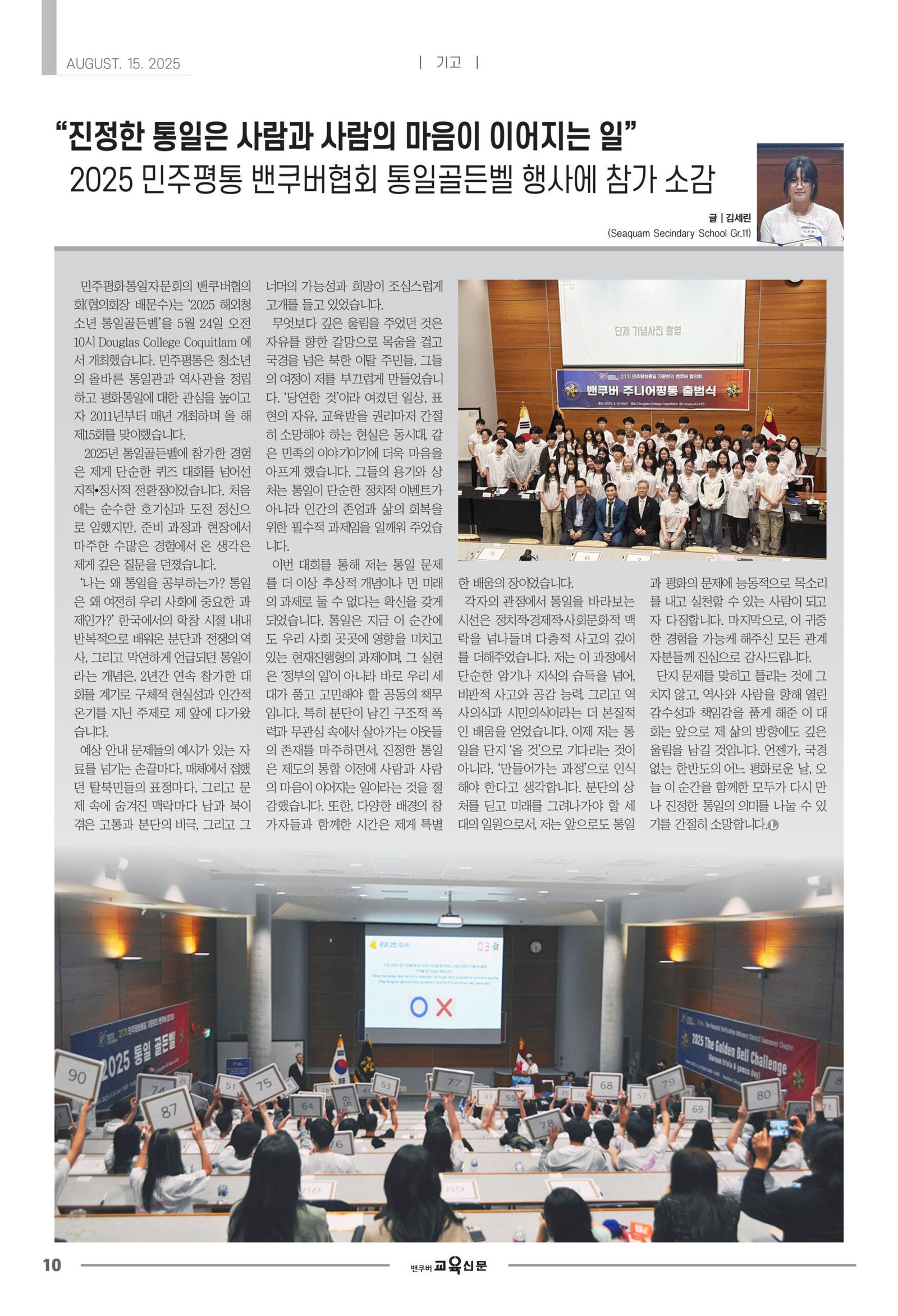 JNJ 소식 작성자 Ji Lee 작성일 2025-11-17 09:44 조회 25 김세린 통일골든벨 행사 참가 소감 발표 좋아요 1 싫어요 0 인쇄 전체 0 추천순 작성순 최신순 작성자 비밀번호 사진 첨부파일 목록보기 이전 다음 민주평통 북한 이탈주민 간담회에서 우수활동상 수상 27 1 김세린 통일골든벨 행사 참가 소감 발표 25 1 모국 산불피해 성금 주밴쿠버총영사관에 전달 151 1 민주평통 2분기 정기총회에서 노재명 자문위원 감사패 받다 152 1 민주평통 주니어 구성과 설립에 공헌 147 1 주밴쿠버총영사관&밴쿠버교육신문 주최 3회 글짓기대회 후원 153 1 민주평통 밴쿠버협의회 2025 골든벨 행사 진행 147 1 영화 포레스트 검프와 장애인에 대한 사회적 인식/이제현 281 1 제니퍼 노원장 민주평통 설날잔치 행사 주도 296 1 12345»마지막 전체 제목 내용 작성자 검색 Department Head Vanessa Blue Email mathematics@divihigh.com