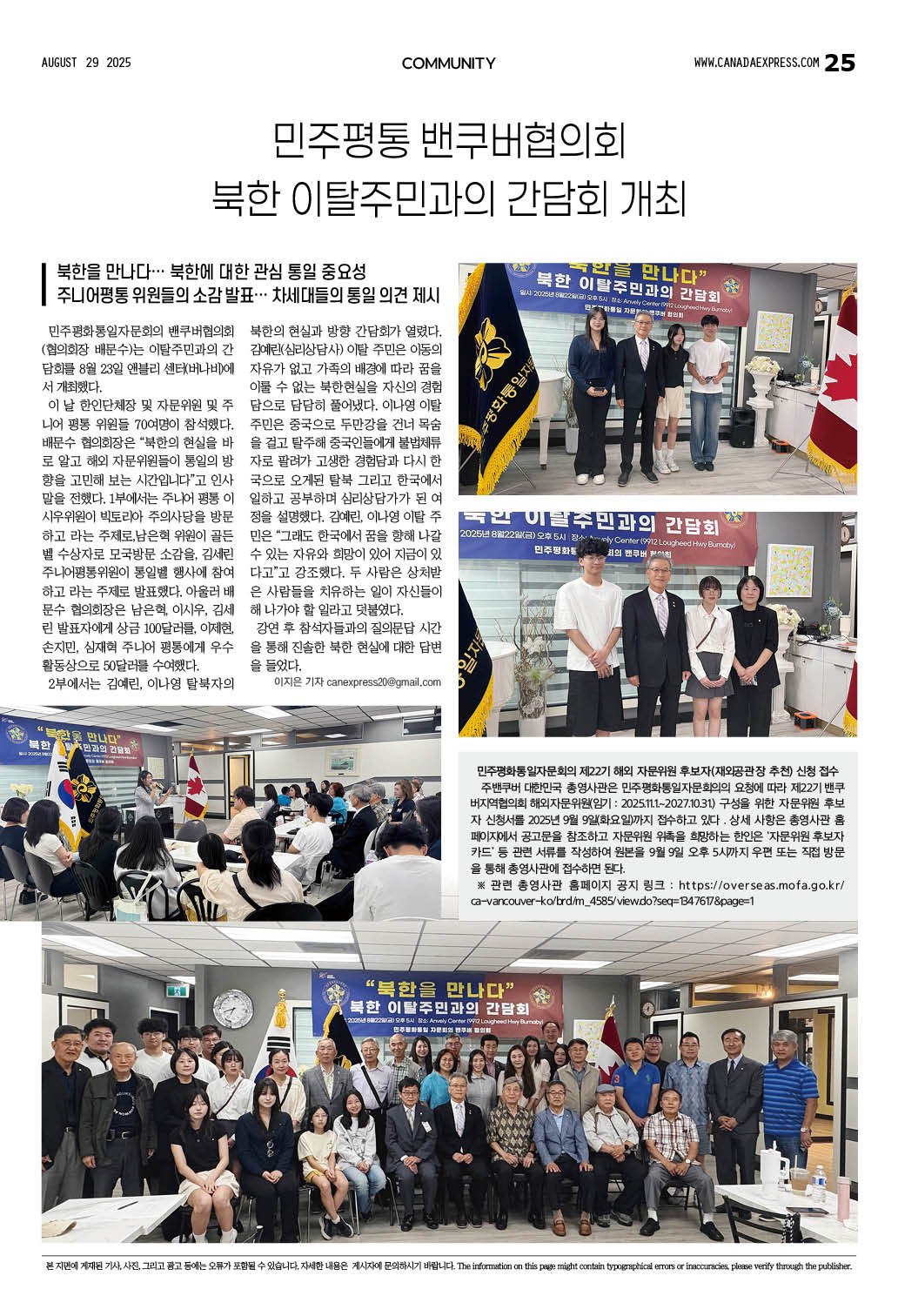 JNJ 소식 작성자 Ji Lee 작성일 2025-11-17 09:51 조회 83 민주평통 북한 이탈주민 간담회에서 우수활동상 수상 8월 29일 열린 민주평통 밴쿠버협의회 북한 이탈주민과의 간담회에서 JNJ 에듀케이션 남은혁 김세린 이제현 주니어 평통이 우수 활동상을 수상했습니다. 아울러 남은혁 김세린 학생은 소감을 발표해 참석자들의 박수를 받았습니다. 좋아요 1 싫어요 1 인쇄 전체 0 추천순 작성순 최신순 작성자 비밀번호 사진 첨부파일 목록보기 이전 다음 12월 한 해 수고하셨습니다 57 0 민주평통 북한 이탈주민 간담회에서 우수활동상 수상 83 0 김세린 통일골든벨 행사 참가 소감 발표 73 0 모국 산불피해 성금 주밴쿠버총영사관에 전달 200 1 민주평통 2분기 정기총회에서 노재명 자문위원 감사패 받다 195 1 민주평통 주니어 구성과 설립에 공헌 180 1 주밴쿠버총영사관&밴쿠버교육신문 주최 3회 글짓기대회 후원 182 1 민주평통 밴쿠버협의회 2025 골든벨 행사 진행 178 1 영화 포레스트 검프와 장애인에 대한 사회적 인식/이제현 317 1 12345»마지막 전체 제목 내용 작성자 검색 Department Head Vanessa Blue Email mathematics@divihigh.com